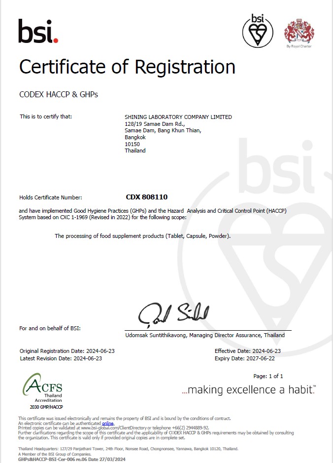 โรงงานชายนิ่ง แล็บออราทอรี่ จำกัด ได้รับการรับรองมาตรฐานจากหน่วยงานภาครัฐและองค์กรระดับสากล ทั้งด้านคุณภาพ ความปลอดภัย และความน่าเชื่อถือในกระบวนการผลิตทุกขั้นตอน