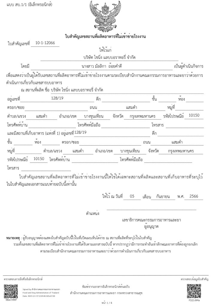 โรงงานได้รับการจดทะเบียนถูกต้องตามกฎหมายกับ